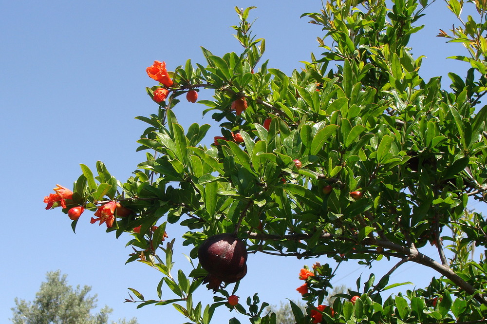 Granatapfel (Botanisch: Punica granatum) vor der Landschaft des Haut-Languedoc